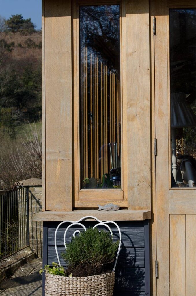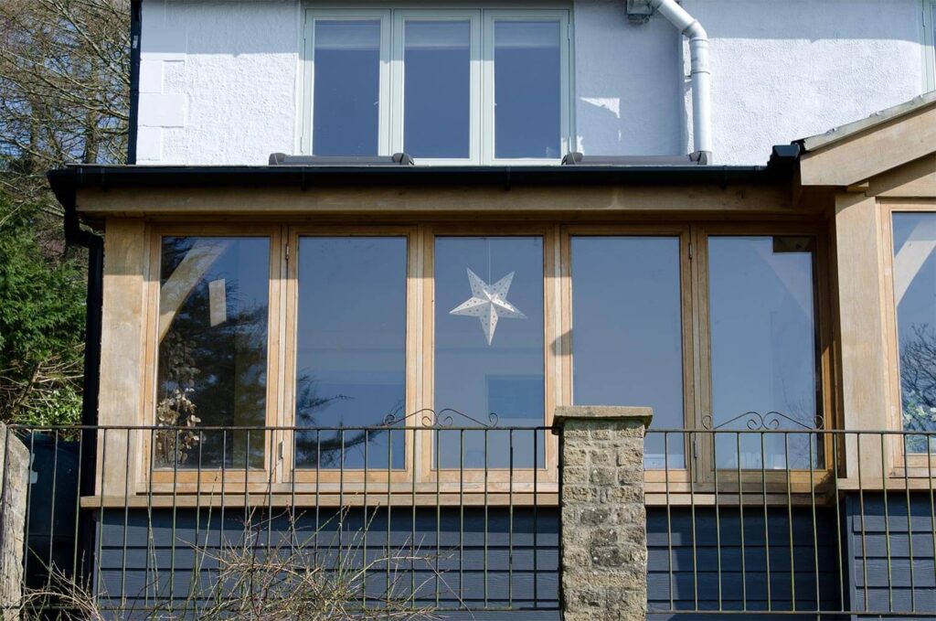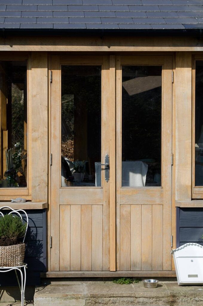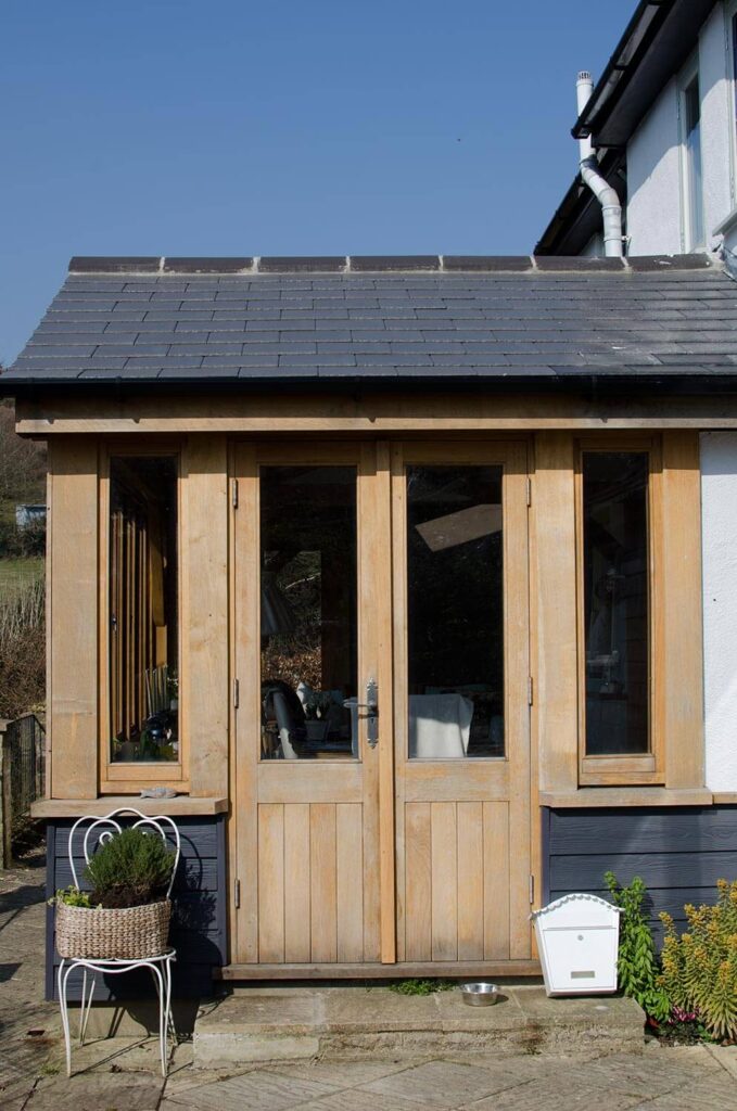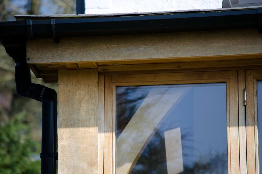Oak timber framed extension in Morcombelake with double-glazed windows and doors